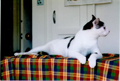 His favorite activities were: ¤ sharpening his claws on my living room furniture and human legs; ¤ drinking water from the kitchen faucet; ¤ terrorizing my guests; ¤ sitting on whatever it was I was reading; ¤ pretending he was the centerpiece on my kitchen table; ¤ sitting on my lap and purring while I told him how pretty he was and then biting me to let me know when he had enough; ¤ sleeping; ¤ picking on Darlene